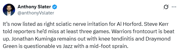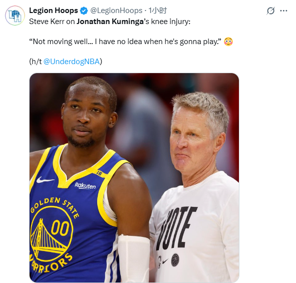 北京时间11月24日,勇士又遭伤病打击,39岁霍福德遭遇詹姆斯式伤病,据勇士随队记者Anthony Slater报道,霍福德的伤情确诊为右侧坐骨神经痛;库明加遭遇膝伤困扰,暂无复出时间表,科尔直言:我不知道他何时才能复出。