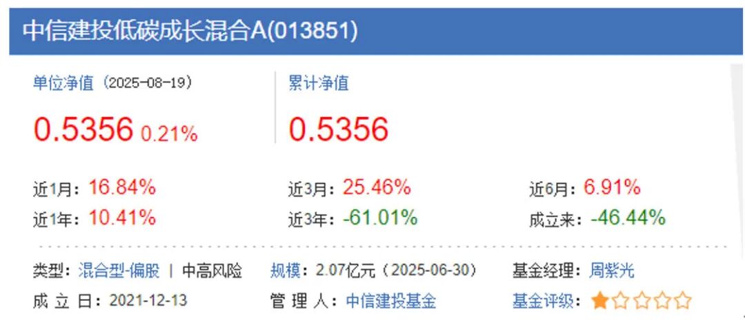 我们通过梳理公募混合型基金的年内排名发现:处于“底部”的产品有一只为中信建投低碳成长混合基金,净值目前仅有0.5356(截至8月19日)。