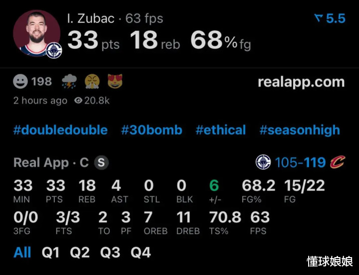 祖巴茨今天打得还相当不错呢,打了33分钟,22投15中,拿到33分18板4助。
