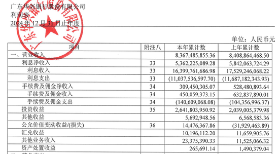 2024年,广东华兴银行实现投资收益26.42亿元,同比增长29.56%;实现公允价值变动收益1447.64万元,同比增长145.34%;合计占营业收入比例由2023年的23.87%增至31.75%。