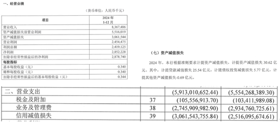只是在广东华兴银行2024年年报的经营业绩和利润表项目分析中均显示资产减值损失也是30.62亿元,但在审计报告中则显示信用减值损失为30.62亿元,并未列示资产减值损失情况。