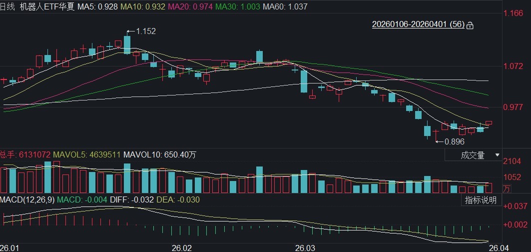 截至4月1日,机器人ETF华夏(562500)高开高走全天走势稳健,展现出企稳修复态势。结合机器人ETF华夏(562500)的近期走势与行业重磅事件,我们来详细梳理一下这一季度的逻辑。